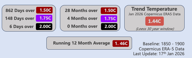 The counts shown here are based on “Copernicus ERA-5” daily global 2m surface temperatures (see GMST Data Sets and Copernicus 1850-1900 Baseline – Daily GMST Anomaly). As per Climate Reporting – Why so many different values the Copernicus data is midway between “Berkeley Earth” (which runs 0.08C hotter) and “NOAA / GISSTemp” (which both run about 0.08C colder). All the GMST Data Sets I have been working with have virtually the same trends, with most of the difference in reported anomaly happening before the 1970s.