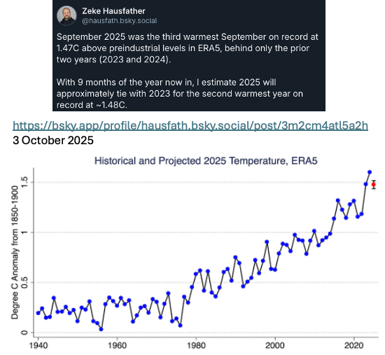 Here is the Bluesky post from Zeke Hausfather on 3rd October 2025, showing the expectations for 2025 full year.
