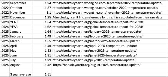 I noticed that for Berkeley Earth the 3-year-average is also above 1.5C. This averaging is done by weighting each of the numbers in the table, by the number of days in that month / year.