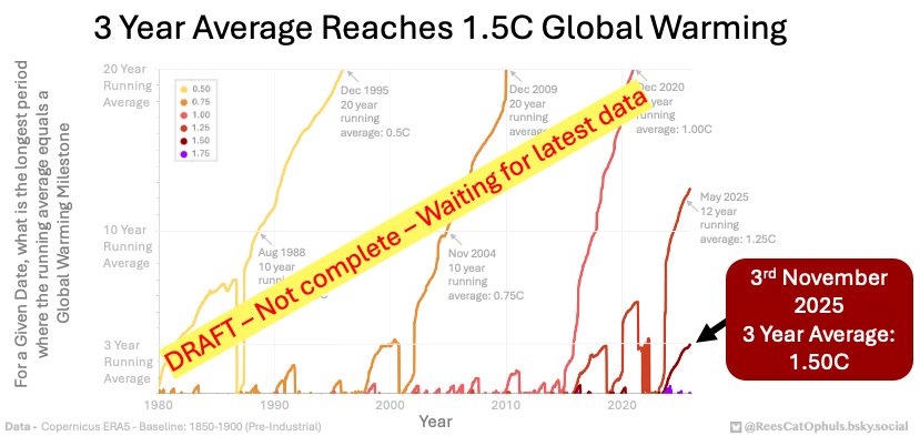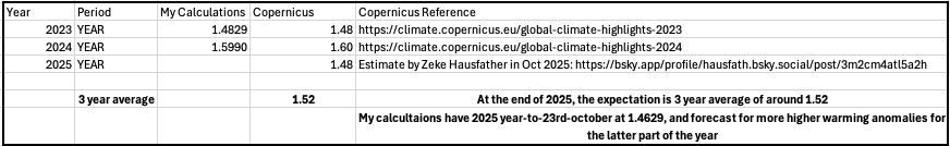 Here, I look at the data published by Copernicus, and Zeke Hausfathers post, regarding expectations for 2025. This shows that the 3 year average for 2023, 2024, 2025 is expected to exceed 1.5. The “My Calculations” column is for the data I user, as per: Dataset: GMST Data Sets and Data Handling: Copernicus 1850-1900 Baseline – Daily GMST Anomaly. I show it in this table, simple to show my data is very well aligned with that published by Copernicus on their website.