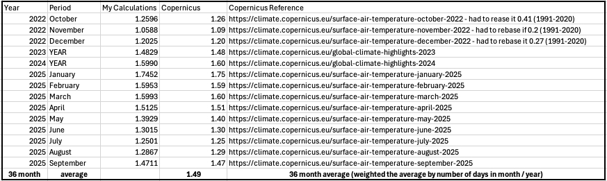 Given that I’m saying the running 3 year average crossed 1.5C on a particular date, this sanity check is more granular, at the monthly level. Here, I look at the data published by Copernicus. This shows that the 36 month average up to September 2025 (inclusive) is nearing 1.5C. The “My Calculations” column is for the data I user, as per: Dataset: GMST Data Sets and Data Handling: Copernicus 1850-1900 Baseline – Daily GMST Anomaly. I show it in this table, simple to show my data is very well aligned with that published by Copernicus on their website. Note that for 2022 months, Copernicus doesn’t explicitly give the warming anomalies relative to 1850, so I use the adjustments I have calculated as per Baseline Adjustment Evidence, to get from a Month-in-2022-relative-to-1991-2020-baseline, to the anomaly relative to 1850-1900.