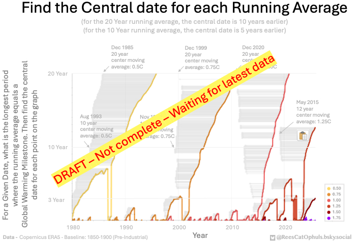 I used the data (See GMST Data Sets) from Copernicus, and applied parsing (see Copernicus 1850-1900 Baseline – Daily GMST Anomaly) to get daily GMST Anomaly values. Then I reduced the granularity to 7-days (rather than daily) because the recursive nature of this process (described below) would have taken weeks if I tried to do it with daily data. Then for each date, recursively work out the running average for the last week, 2 weeks, 3 weeks, … years … and if the running average has reached 1.5C keep track of the number of weeks for that running average. Let it go right back to the start (I used data from 1960-present) and you have the longest-running-average for 1.5C for that date. E.g. The result showed that in the first week of December 1995 the longest running average which gives 1.5C was twenty years. Then do this process again for each of the global warming milestones: 0.5C, 0.75C, 1.00C, 1.25C, 1.50C. I had to do various optimisations to keep the run time down. Took about 20min to get the data. Then put it on a graph.
