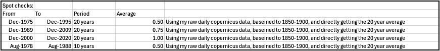 I have a spreadsheet, which gives the daily anomalies, so I just did some spot checks in excel to check the numbers are the same as that created by my python program.