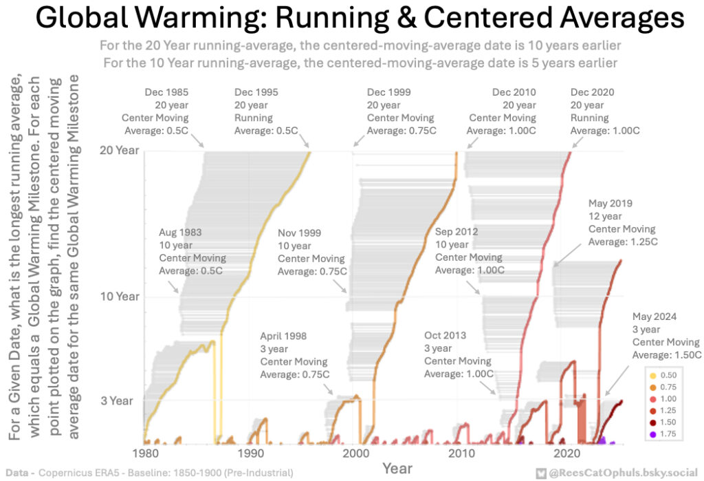 The previous graph begged for this next one. Given that a 20-year-running average uses 20 years of data, it seems interesting to know show the centre-date for the 20-year period … and the same for the rest of the graph. This was something I’ve been trying to get my head around: For those that advocate waiting for 20 years of data, before declaring we have crossed 1.5C, what difference has waiting for that long made in the past? … From this graphic, it seems that you can call it with a 9 year centered-moving-average. It is just one more piece of analysis that suggests (with Copernicus ERA5 data) we one day look back and decide we crossed 1.5C somewhere between 2024 and 2028.