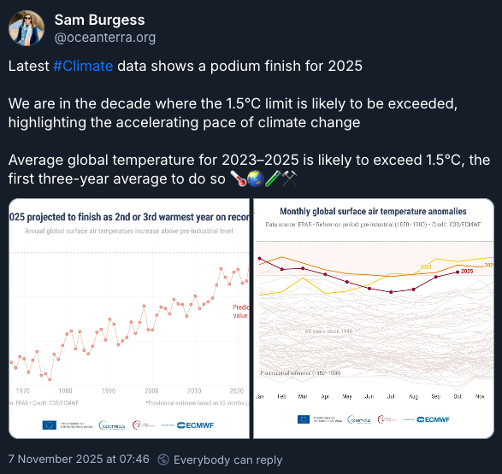 Eliot Jacobson made another post on 10th November 2025 (as per screenshot below), calling the 8th November 2025 as the day that the 3-year-average has crossed 1.5C. This means I called it 4 days earlier (I posted on the 6th November, and my data had the 4th November as the day we crossed 1.5C 3-year-average). This is consistent with some other comparison (where Eliot counted the number of days in 2023, 2024, 2025 which are above 1.5C), as I seem to be running a tiny bit warmer/ahead of Eliot. Probably something to do with rounding/leap-year-handling. I make no claims to be more accurate than Eliot, and to be only 4 days difference in 1096 days is not bad. Would prefer if Copernicus just gave the temperatures relative to 1850-1900, rather than people working it out independently.