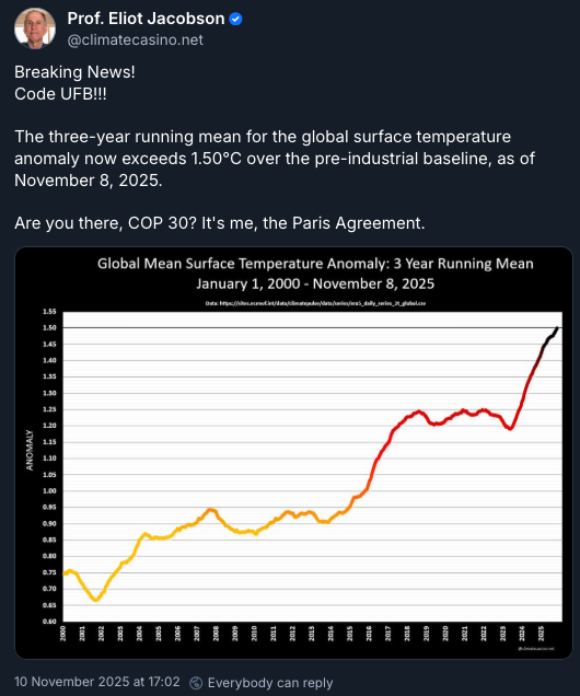 The 3 Year Running Average for Global Warming crossed 1.5Cin November 2025 (ERA5 data).